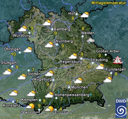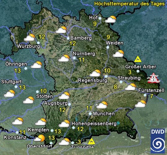 Am Dienstag zunächst viele Wolken von Oberfranken bis Niederbayern noch etwas Regen. In der zweiten Tageshälfte trocken und in der Südwesthälfte vermehrt Sonne. Dort milde 10 bis 13 °C, in der Nordosthälfte nur 6 bis 10 °C. Im Süden schwacher, im Norden mäßiger Westwind.