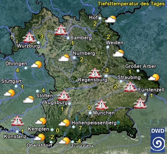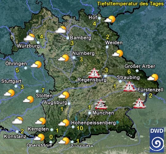 In der Nacht zum Mittwoch vor allem im Flachland häufig Ausbildung von Hochnebel und dichten Nebelfeldern. Tiefsttemperatur +4 bis 0, Richtung Alpen sowie am Bayerwald bei klarem Himmel leichter Frost bis -2 °C. Vereinzelt Glätte.