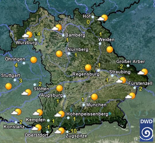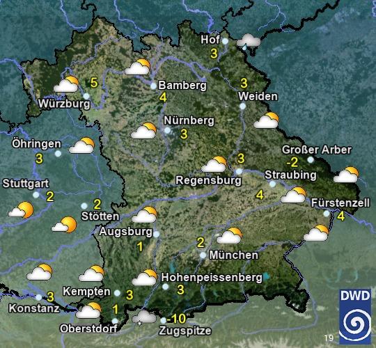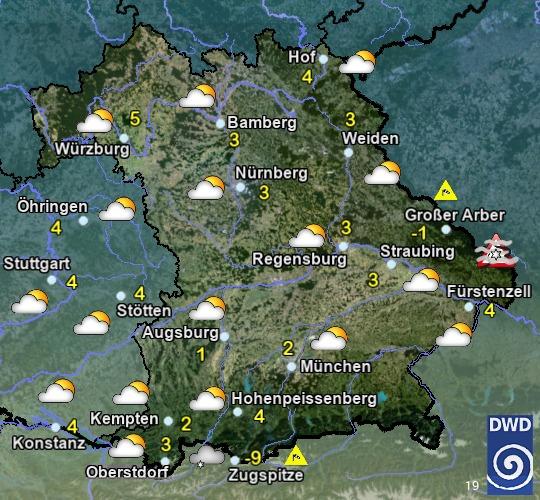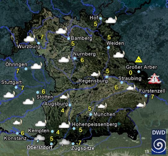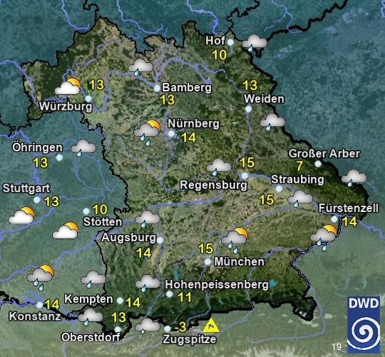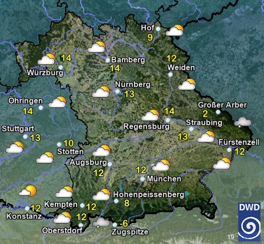 Heute zeitweise, im Süden Bayerns häufig Sonne. Nördlich der Donau im Tagesverlauf vermehrt Quellwolken und einzelne Schauer, im nördlichen Franken und der Oberpfalz eventuell auch einzelne Gewitter. Höchstwerte zwischen 19 und 24 °C. In Franken mäßiger Wind, von Süd auf Nordwest drehend. Sonst schwachwindig.