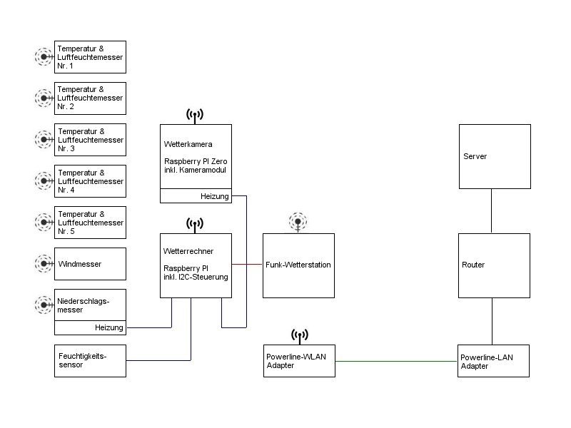 Als Rechner zur Auswertung der Wetterstation ist jetzt ein Raspberry PI im Einsatz. Die ermittelten Wetterdaten werden durch eigene Programme aufbereitet und an den Server gesendet. Ferner werden mit diesem Rechner der Feuchtesensor ausgewertet und die Heizungen der Kamera und des Niederschlagsmessers gesteuert.